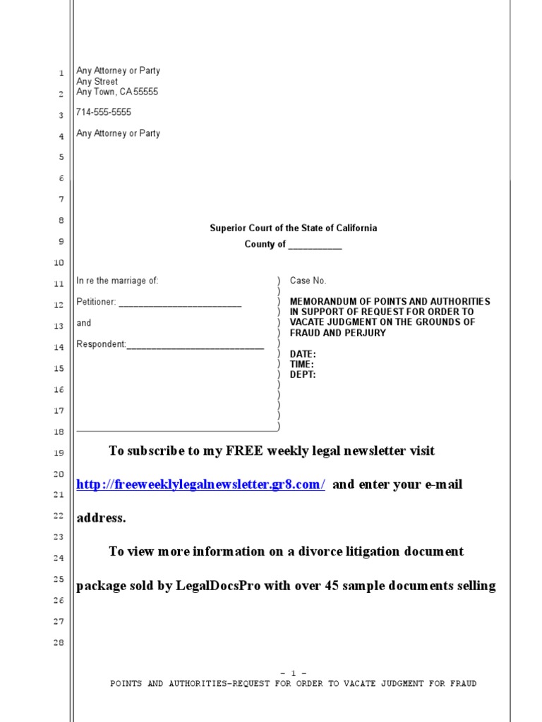 Sample Motion To Vacate California Divorce Judgment For Fraud and